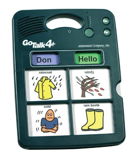 GoTalk 4+ is lightweight and rugged, like all GoTalks, and now has a 20 message capacity (4 large keys, each 3" square, and 5 recording levels). PLUS two core messages that remain constant when you change levels. Great for essentials, like Hello or All done . PLUS all new technology providing superior sound with volume control. PLUS easier sequential recording, an option for whole-level erasing and built-in overlay storage. Even with all of these new features, it's a GoTalk so it's still easy-to-use and affordably priced! Size: 9" x 12" x 1" (23 x 30.5 x 2.5cm). Weight 23 oz.(652g). Two "AA" batteries (included). Overlays can be made with your own photos or GoTalk Software. Development Category: Communication/Language / Augmentative Alternative Communication. Sold as a Single Unit. UNSPSC/NIGP Education Reference Codes: /78500000